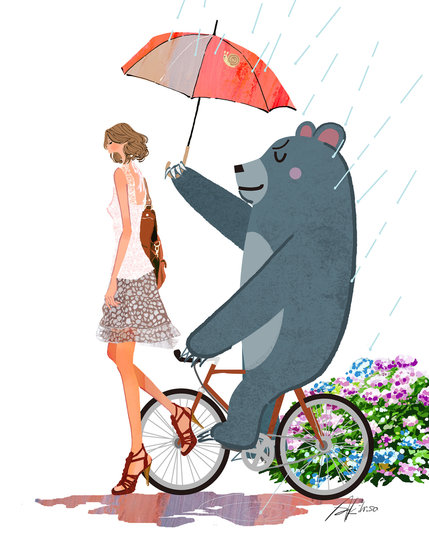 クマが自転車で女の子に傘を差すイラスト/雨の日のサプライズ