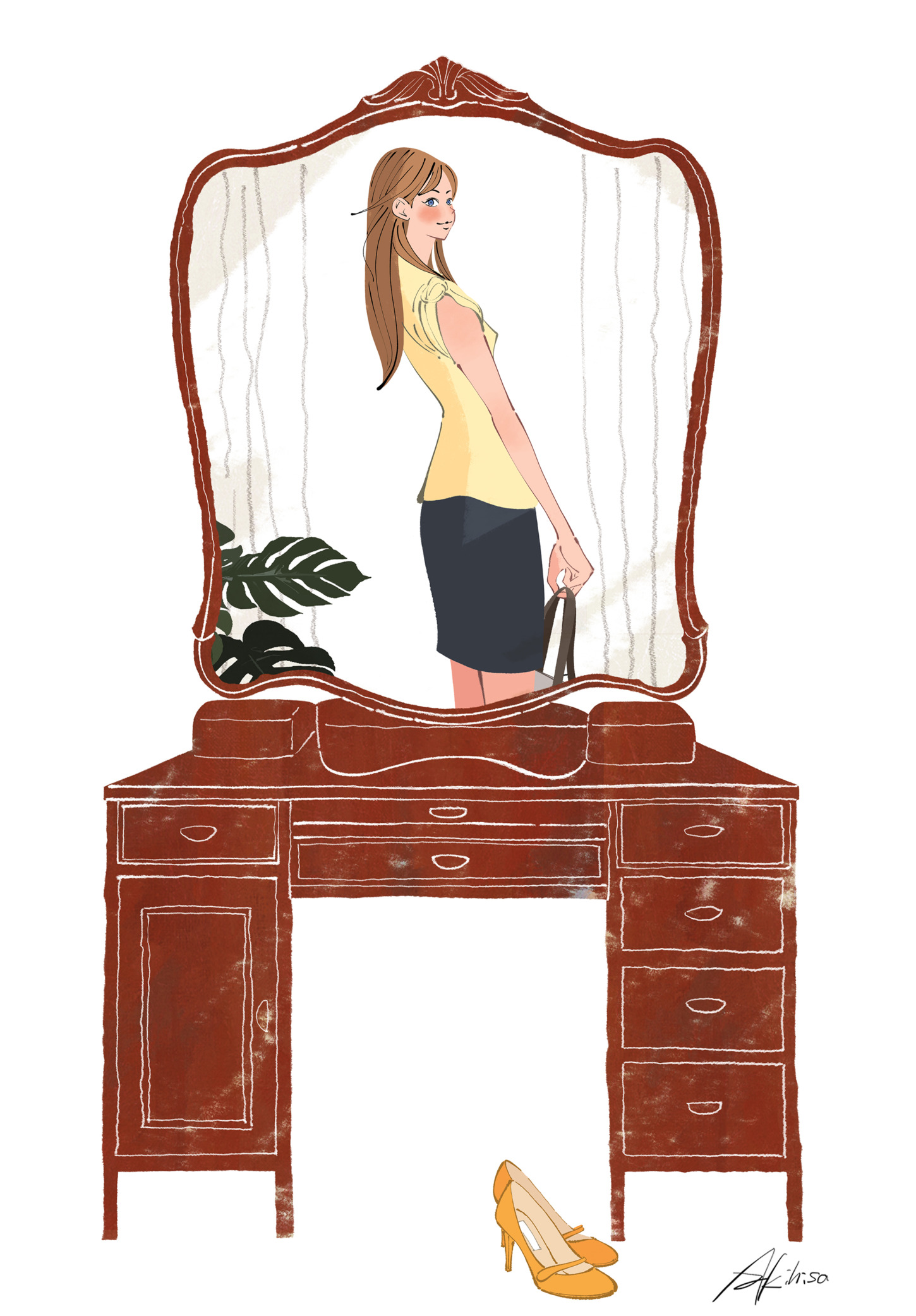 アンティーク調のドレッサーと、身支度を整える女性の日常的なワンシーンを描きました。